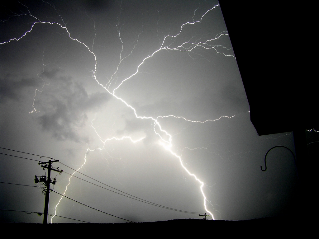 The replacement camera was an Olympus camera with a 10x zoom - just a small point and zoom. At the time, 10x optical zoom was really something - nowadays it's nothing. This camera was 4.1 MP, and I took many thousands of photos with it. I got down on the ground and took pics of the forest floor (lichens are cool!!!). I took pictures of moving water. One night I took 60 pictures (no lie) of a black sky as a thunderstorm marched up the valley to the back of my house. Disgusted, I went inside and quit. Except I started playing with settings and figured out I could do a '15 second' exposure in one of the more advanced modes. So I went out on the front porch, where the storm was at by now, and the third shot, I got this.